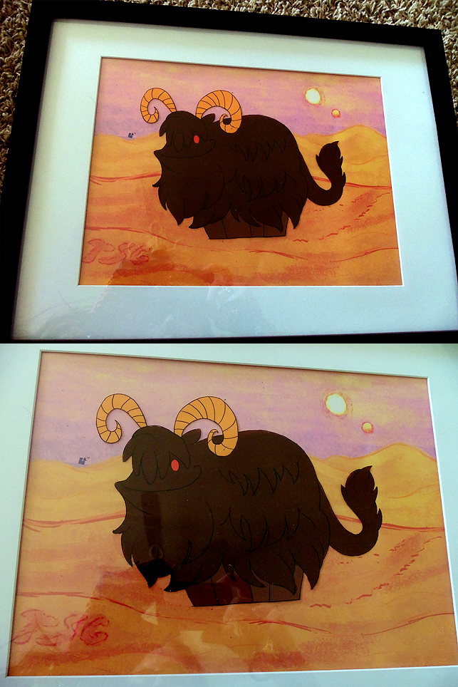 Example of an animation cel. This is a bantha, from Star Wars. The character is painted onto the cel, while the background is a digital print.